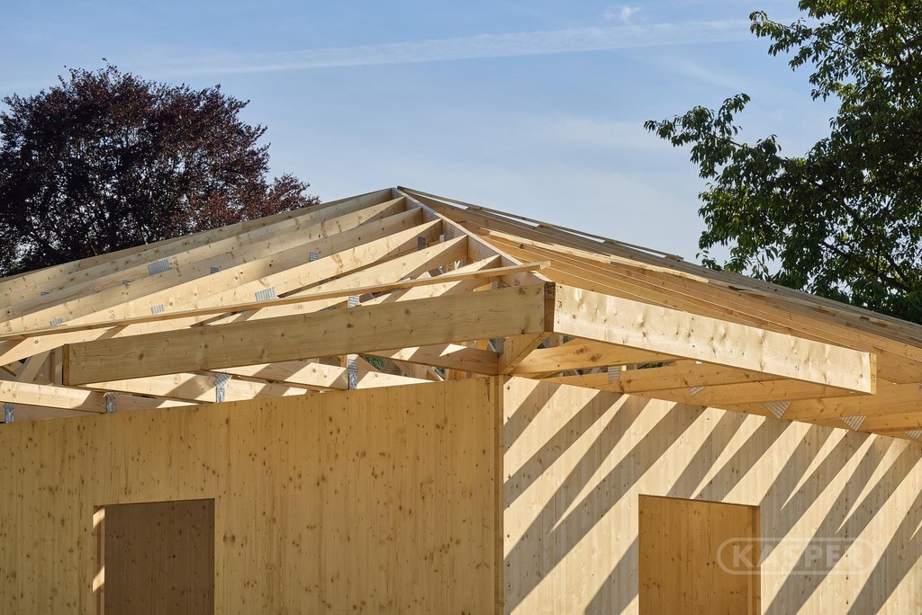 Für die tragende Konstruktion von Wohn- und Gartenhäusern wurden CLT-Paneele (Kreuzlagenholz) verwendet. Diese innovative Technologie der kreuzverleimten Holzlagen bietet außergewöhnliche Festigkeit und Stabilität. CLT-Paneele, die aus kreuzverleimten Holzlagen bestehen, bieten außergewöhnliche Festigkeit und Stabilität. Holz als natürlicher Baustoff sorgt für hervorragende Wärme- und Schalldämmung, was den Wohnkomfort erhöht und den Energieverbrauch des Gebäudes senkt. Die Dachkonstruktion erfolgt mittels Trägern mit einer Verbindungsplatte, wodurch maximale Festigkeit und Stabilität gewährleistet werden. Darüber hinaus ermöglicht dieser Dachtyp eine einfache und zeitlich weniger aufwendige Montage, was den gesamten Bauprozess beschleunigt.