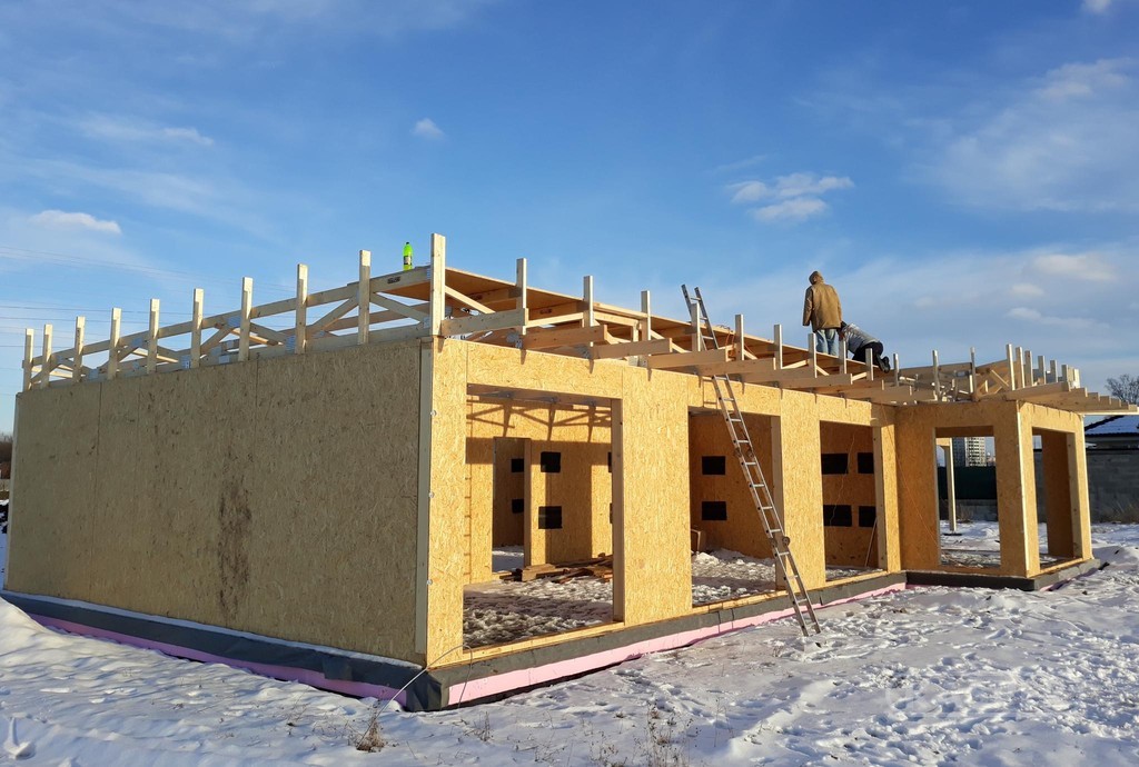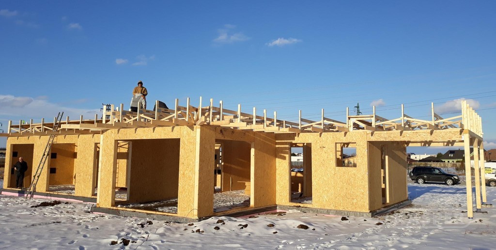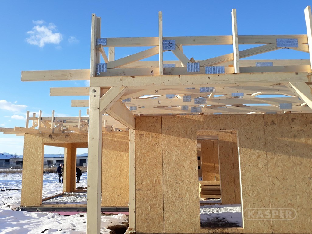Moderní architektura se často vyznačuje hranatými tvary. Pod pojmem moderní stavba si většinou představíme jedno až dvoupodlažní objekt s atraktivní fasádou a plochou střechou. Konstrukční řešení střechy tohoto typu je tradičně řešeno buď železobetonovou deskou, případně dřevěnými nosníky, které jsou doplněny dalšími izolačními vrstvami. Ekonomickou alternativou k tradičnímu řešení jsou dřevěné příhradové vazníky s deskami s prolisovanými hroty. Jednou z hlavních výhod vazníků je možnost vytvořit zastřešení bez potřeby vnitřních nosných stěn (až do rozpětí 30 m). Další zásadní předností ploché střechy tvořené dřevěnými vazníky je, že horní hrana vazníku „kopíruje" navržený spád střechy, takže odpadá nutnost vytváření spádové vrstvy pomocí doplňkových materiálů. Součástí tvarového řešení vazníku je také vytvoření svislé atiky (není třeba ji zdít, případně vytvářet složitou konstrukcí z dřeva), případně vodorovného přesahu kolem celého objektu (viz foto).