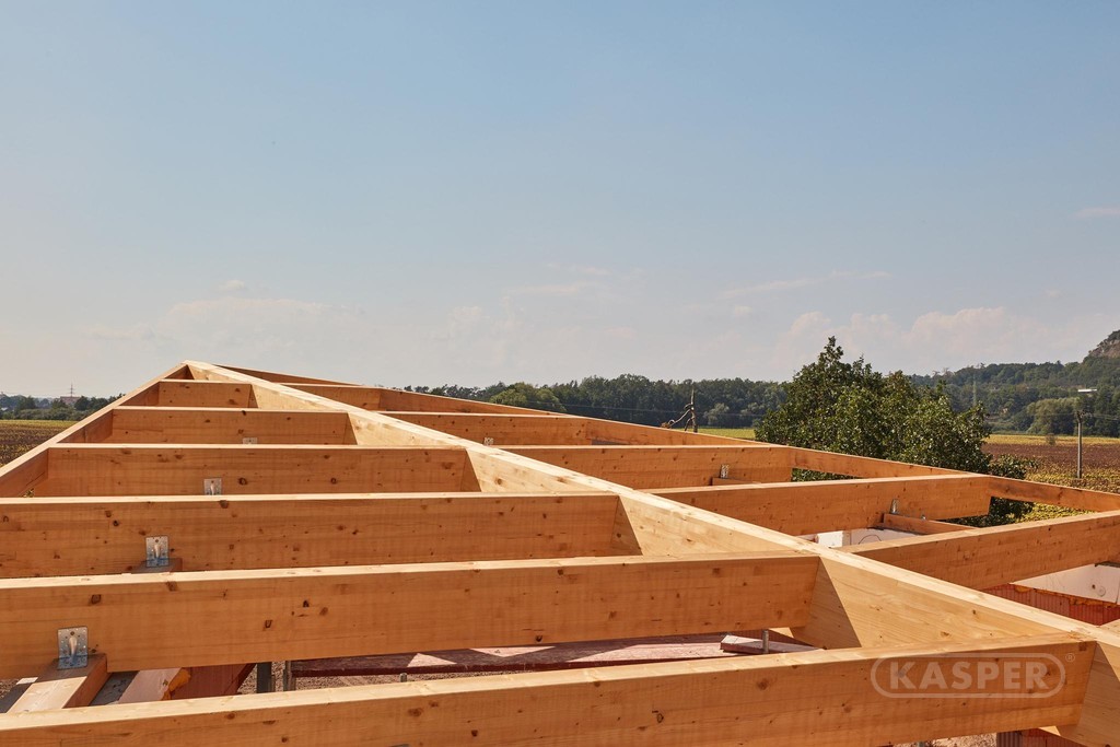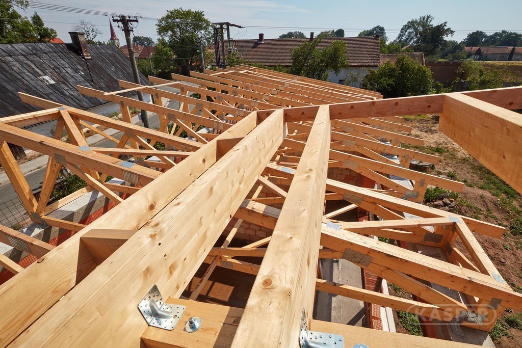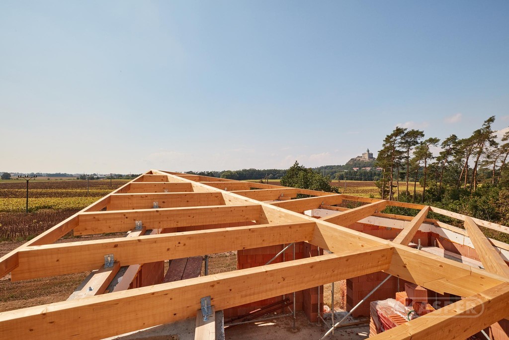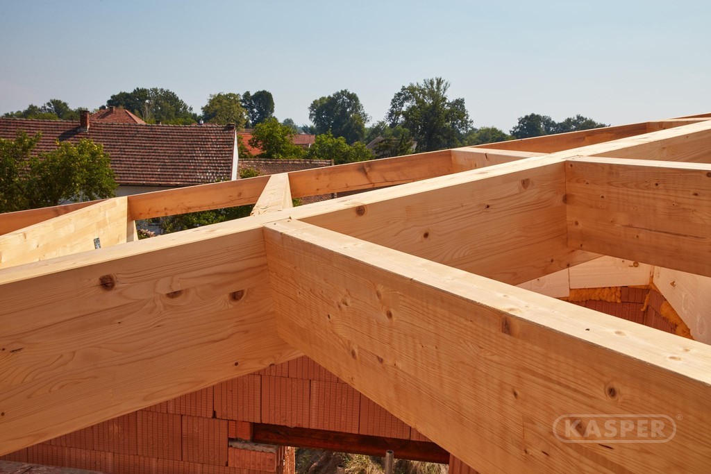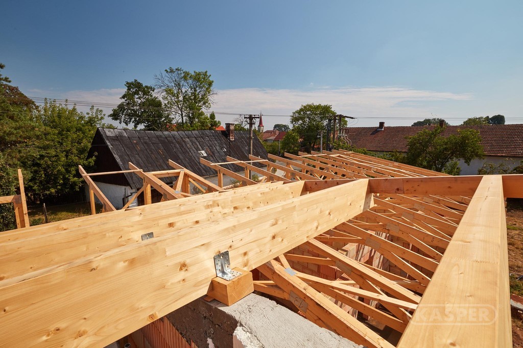 Jde o zastřešení rodinného domu se dvěma výškovými úrovněmi. Přízemní část domu je s pultovou střechou se sklonem 10°. V této části byla použita vazníková konstrukce z hoblovaného řeziva S4S. Střechu v patře domu tvoří průnik dvou obecně položených rovin - střecha má pouze jednu vodorovnou okapovou hranu a jedno nároží. S ohledem na tvar konstrukce bylo rozhodnuto o použití masivních BSH profilů. V nároží prochází hlavní nosná vaznice, do které jsou z obou stran kotveny krokve jednotlivých střešních rovin. Na stavbu bylo použito celkem 9,8 m3 dřeva.