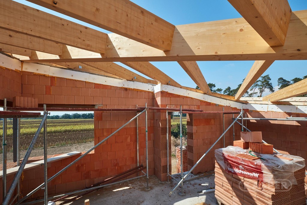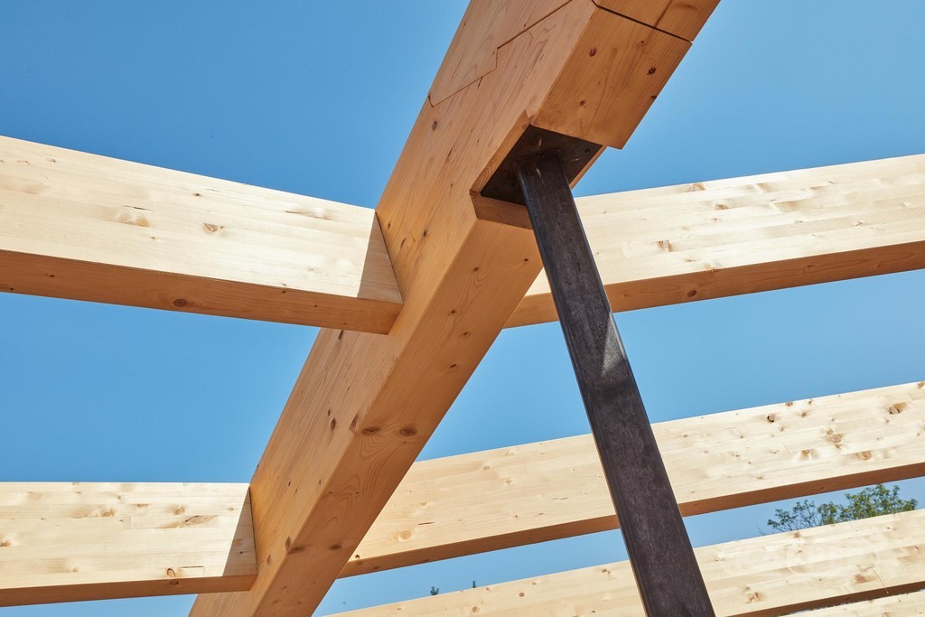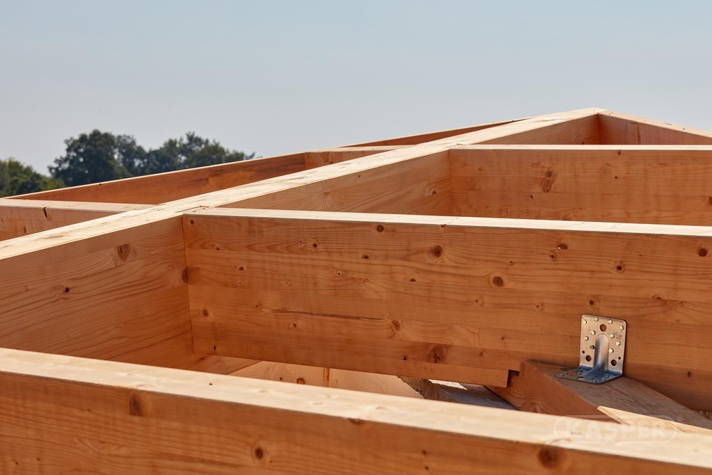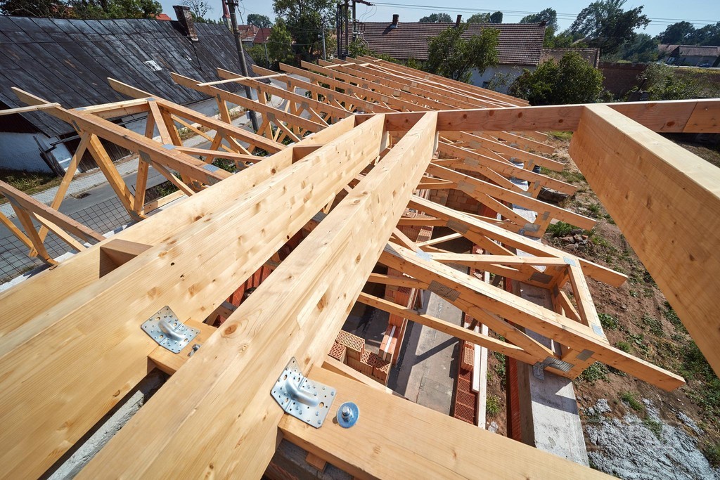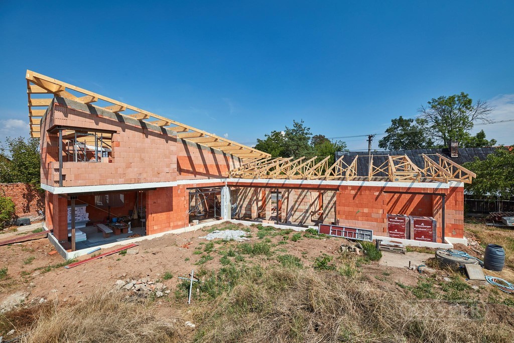 Jde o zastřešení rodinného domu se dvěma výškovými úrovněmi. Přízemní část domu je s pultovou střechou se sklonem 10°. V této části byla použita vazníková konstrukce z hoblovaného řeziva S4S. Střechu v patře domu tvoří průnik dvou obecně položených rovin - střecha má pouze jednu vodorovnou okapovou hranu a jedno nároží. S ohledem na tvar konstrukce bylo rozhodnuto o použití masivních BSH profilů. V nároží prochází hlavní nosná vaznice, do které jsou z obou stran kotveny krokve jednotlivých střešních rovin. Na stavbu bylo použito celkem 9,8 m3 dřeva.